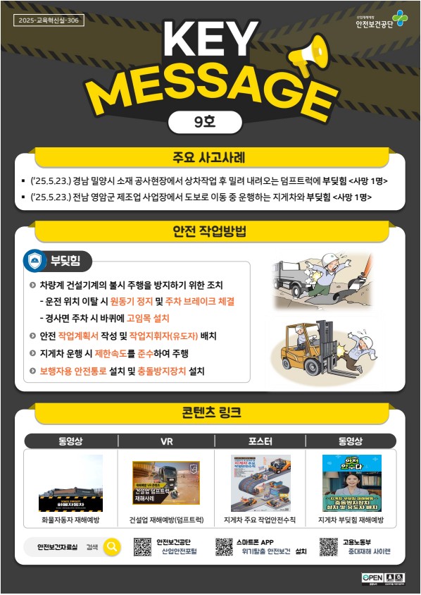 안전보건공단 산업안전포털 안전보건자료실에 [키메세지(9호_부딪힘)] 자료가 게시되었습니다.
